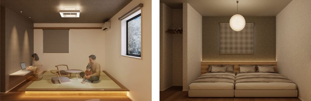 リビングにはあえてテレビを置かず、家族や友人と語らえる場をつくりました。畳を取り入れた小上がりスペースは、くつろぎながら自然と会話が弾む空間です。富良野の豊かな自然の中で、心ゆくまで会話と笑顔に満ちた特別な時間をお楽しみください。